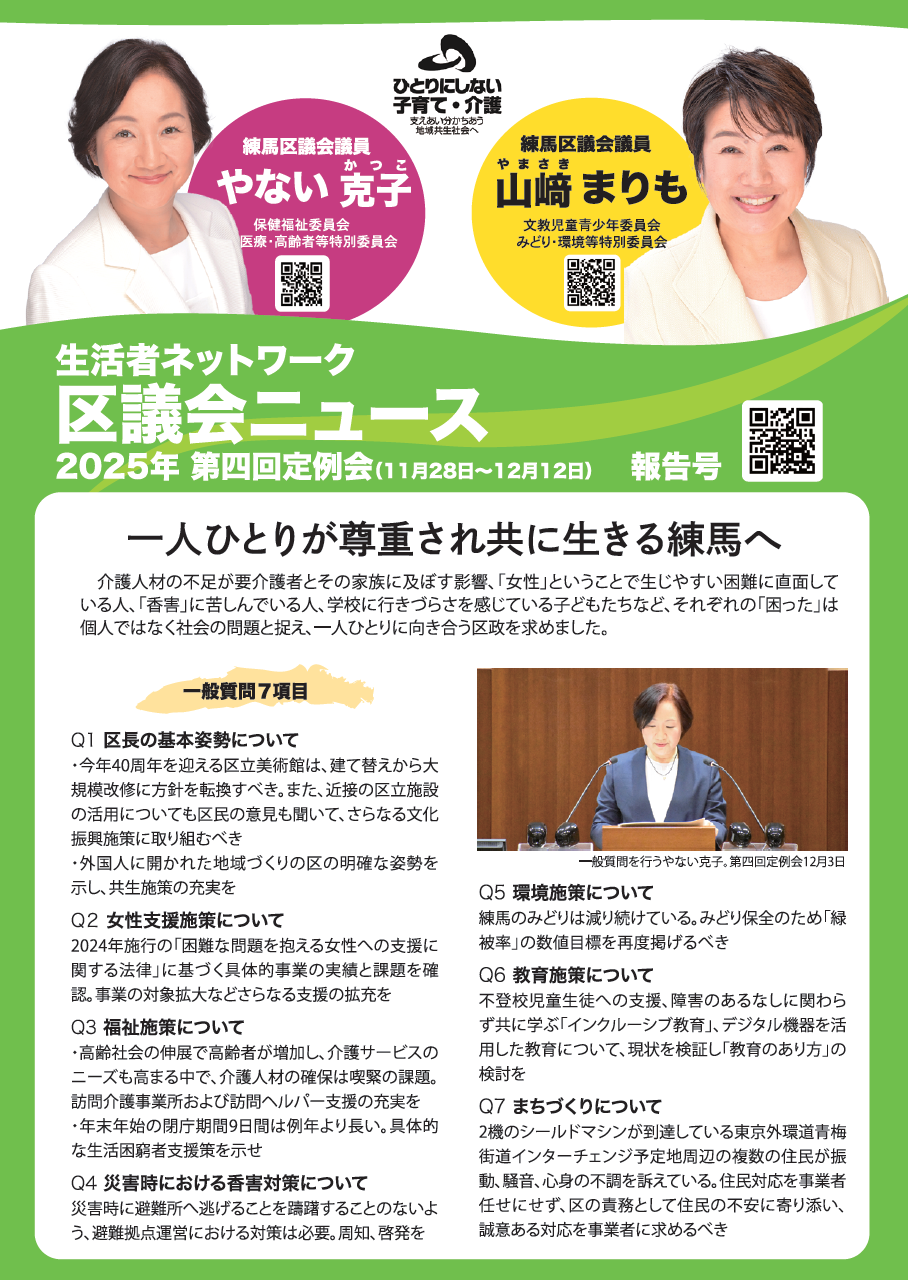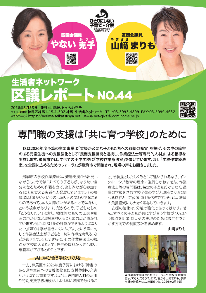 2023年5月30日練馬区議会20期がスタート。会派「生活者ネットワーク」で活動します。